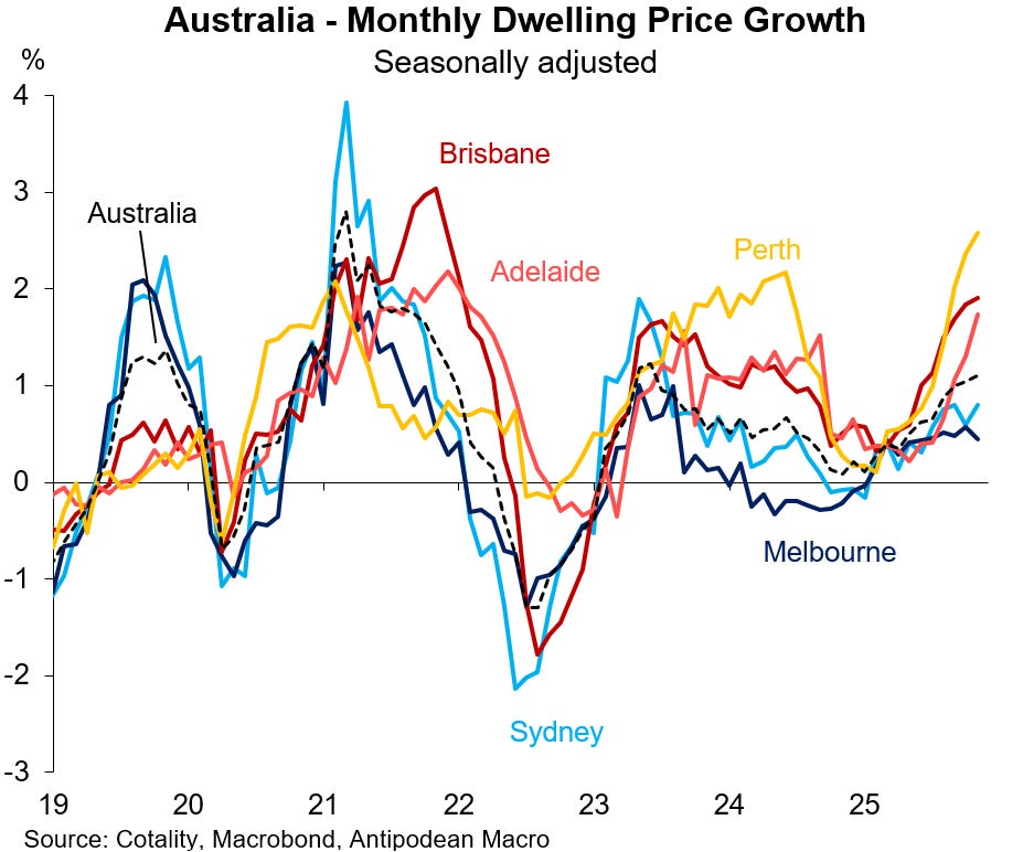 The Australian housing market is gathering momentum amid lower interest rates and ongoing excess demand. Ramped-up government incentives for first home buyers will only add fuel to the fire, at least temporarily. We doubt that APRA’s speed limits on high debt-to-income lending from 1 February 2026 will have much bearing on housing market dynamics.