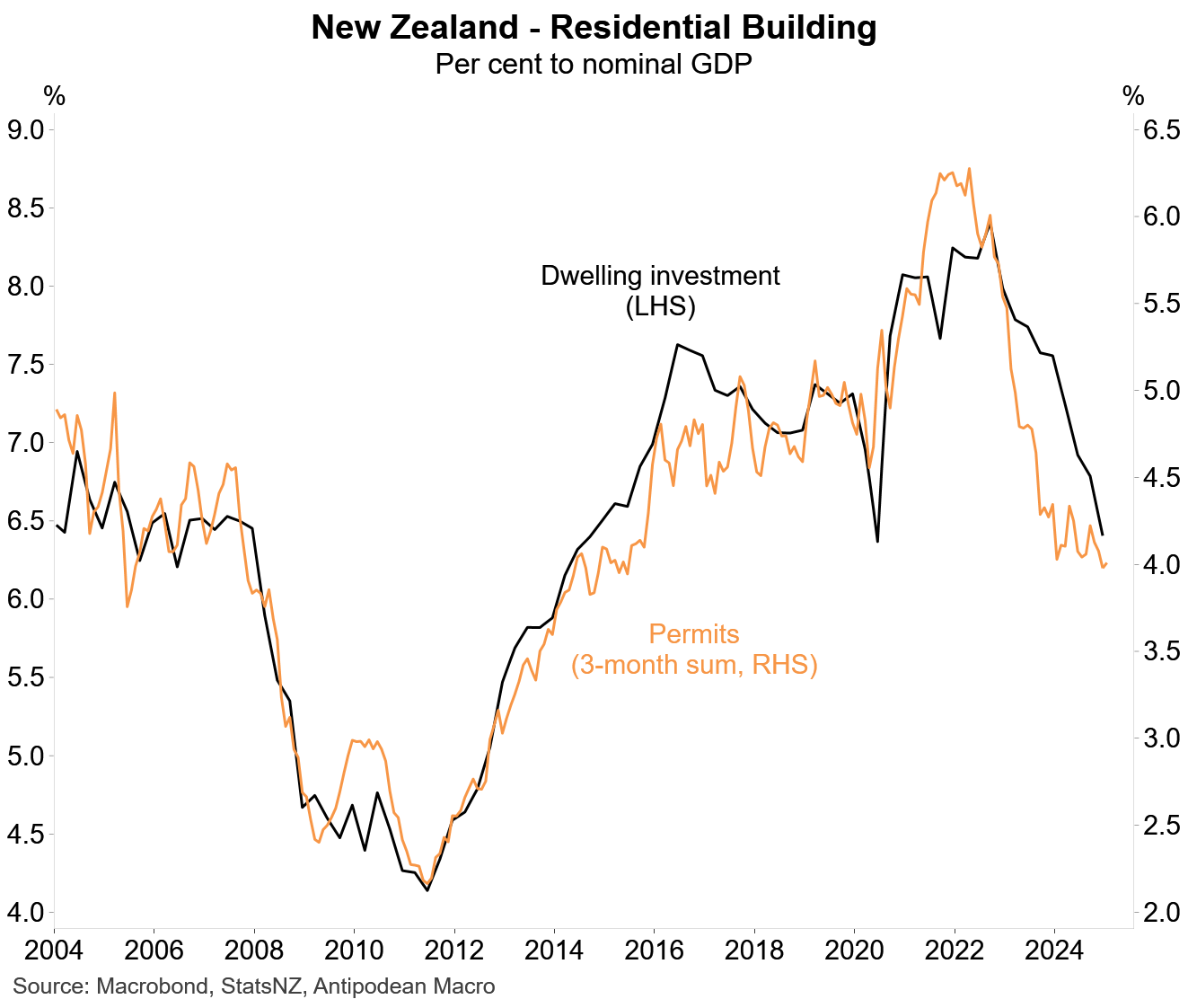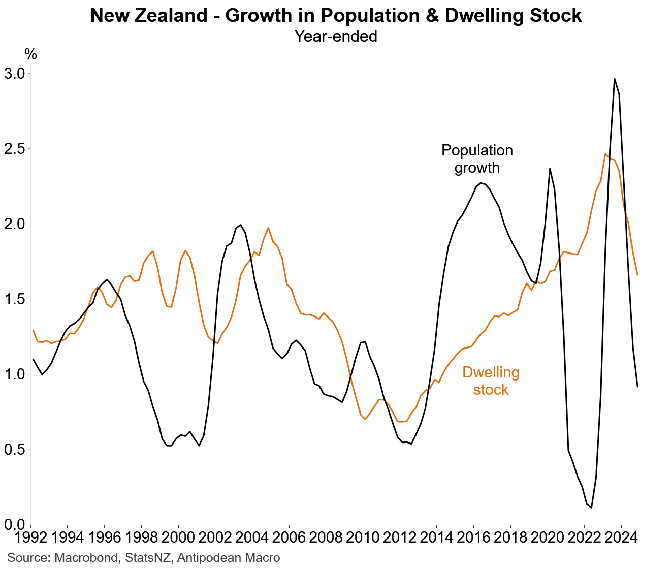 While lower interest rates can be expected to support a pick-up in residential building in New Zealand, there are few signs yet of it happening. The sharp slowing in population growth to be clearly below growth in the dwelling stock also reduces the need to build significantly more housing.