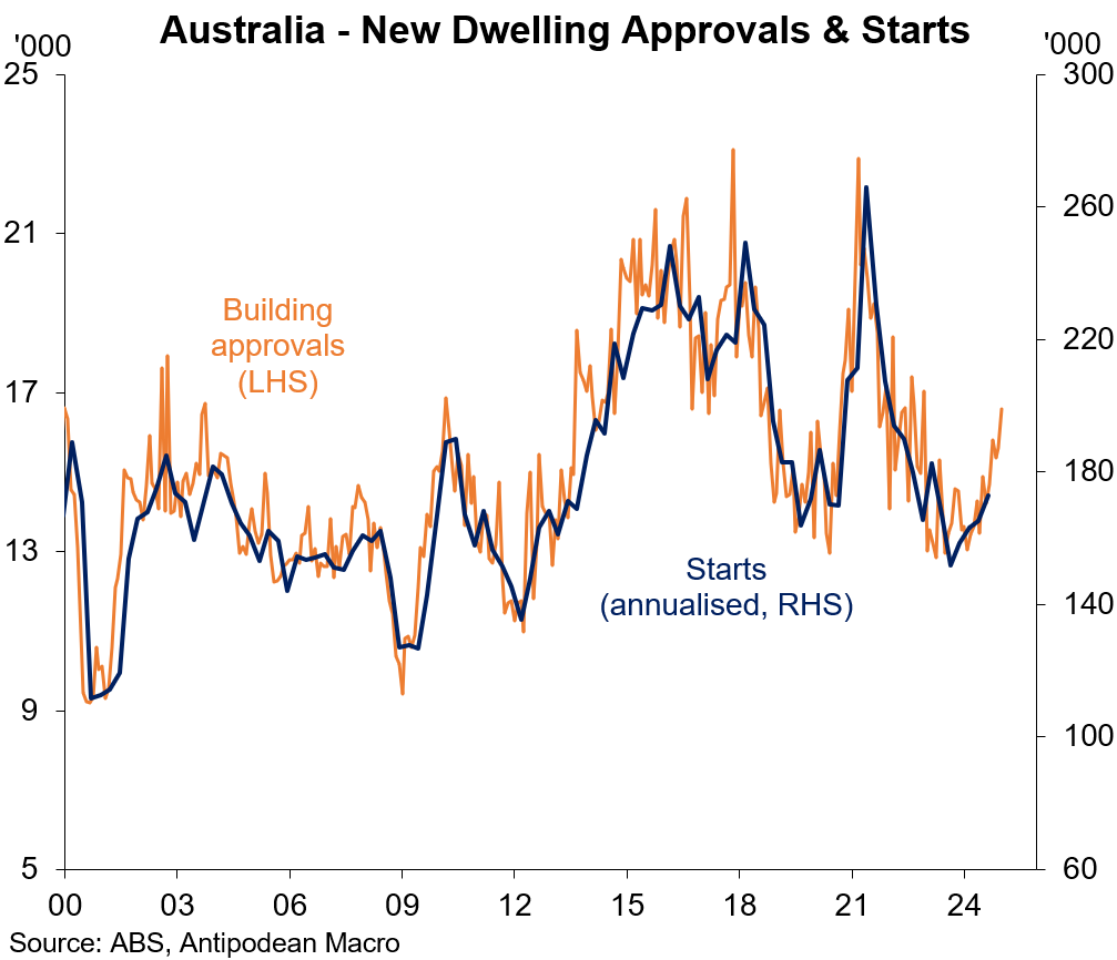 Encouragingly, the number of residential building approvals in Australia has picked up and actual dwelling starts have followed (as usual).