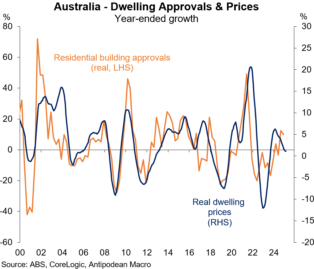 As has historically been the case, the pick-up in home building approvals has occurred against a backdrop of rising real dwelling prices. While the recent slowing in real dwelling price growth may be a near-term headwind to how quickly home building approvals continue to recover, anticipated interest rate cuts over the next 6-12 months should provide a tailwind to both price growth and building approvals.