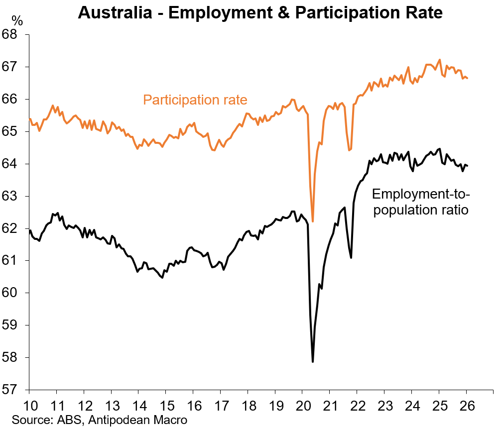 As is often the case, the labour force participation rate has declined alongside falling employment propensity.