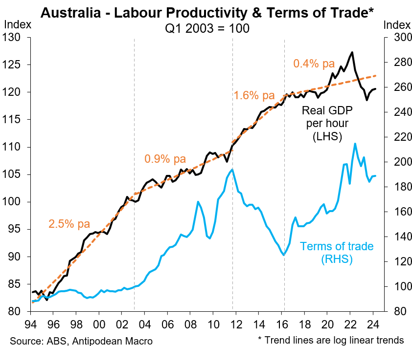 The first part of this piece takes a high-level look at developments in Australia’s terms of trade, labour productivity and government spending.