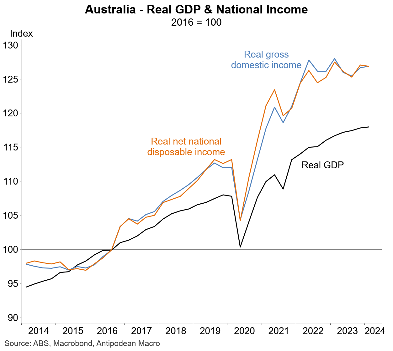 Why does this matter? A high terms of trade increases a country’s collective purchasing power. Measures of Australia’s real national income - as opposed to real GDP - have again benefited from the significant increase in the terms of trade, rising 27% since 2016 compared with just 18% for real GDP.