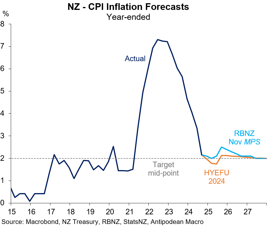 One thing Treasury got mostly right, however, was they anticipated a faster fall in CPI inflation than the RBNZ had forecast earlier this year. The HYEFU forecasts again envisage a weaker headline inflation profile than assumed in the RBNZ’s November MPS.