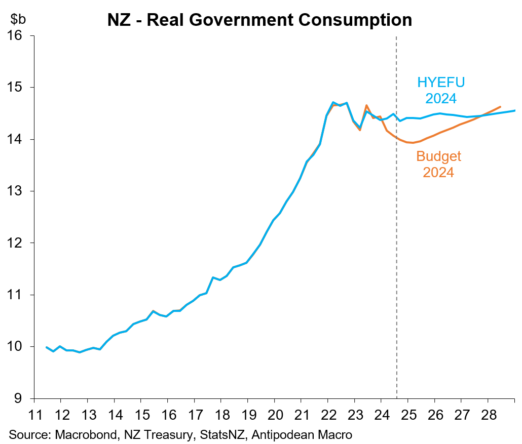 Fast forward to now and the mid-year budget update (HYEFU) shows larger fiscal deficits and higher government debt in coming years. This has largely resulted from the economy being weaker than anticipated by Treasury, notwithstanding that real government consumption not being as weak as previously forecast by Treasury.