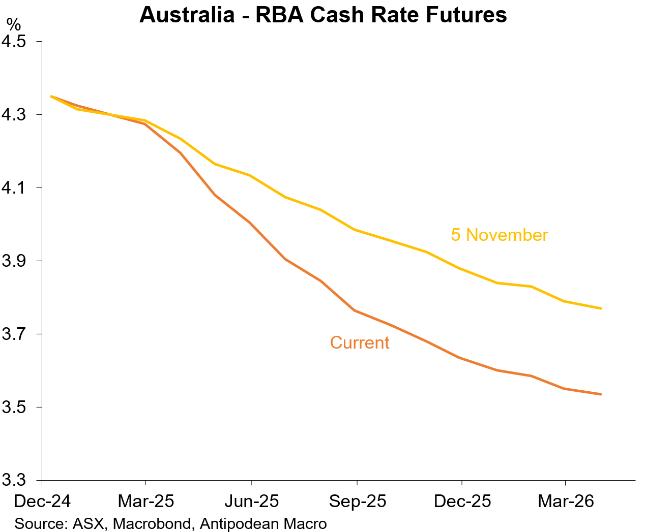 While no-one expects the cash rate to budge tomorrow, market pricing for the cash rate has shifted lower since the early-November Board meeting. A 25bp cut is now expected by the April Board meeting.